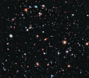 Η φωτογραφία αυτή είναι από το τηλεσκόπιο του Χαμπλ, μερικών εκατοντάδων από τους εκατοντάδες δισεκατομμύριων γαλαξιών σε μια περιορισμένη γωνία θέασης. Ό,τι φαίνεται σε αυτήν, δεν έχει σχέση με τον Γαλαξία μας. Κάθε κουκίδα από αυτές, όσο μικρή και να δείχνει, είναι ένας διαφορετικός γαλαξίας με εκατομμύρια ή δισεκατομμύρια άστρα ο κάθε ένας και φυσικά πολλαπλάσιους πλανήτες. Δεν συζητάμε για τις ασύλληπτες από εμάς και μεταξύ τους αποστάσεις. Κάθε κουκίδα είναι ένας άλλος κόσμος ή και πολλοί μαζί. Δέστε την σε μεγάλη ανάλυση για να δείτε την ποσότητα των κόσμων που υπάρχουν σε ένα μικρό παραθυράκι, σε μια ελάχιστη γωνία θέασής μας. Η θεϊστική εξήγηση για την κοσμολογική ιδανική ρύθμιση, σας ζητάει να κοιτάξτε την εικόνα και να πείτε: